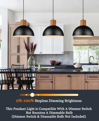 • Sale! ELYONA 12" Hammered Metal Pendant Light, Rubber Wood Dome Hanging Lamp, Modern Pendant Light Fixtures for Kitchen Island, Bar, Farmhouse Dining Room, Bedroom, Hallway - Black