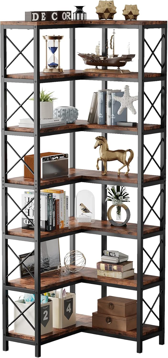 Tribesigns 7-Shelf Corner Bookshelf,Large Modern Corner Bookcase, 7-Tier Tall Corner Shelf Storage Display Rack with Metal Frame for Living Room Home Office (Rustic Brown)